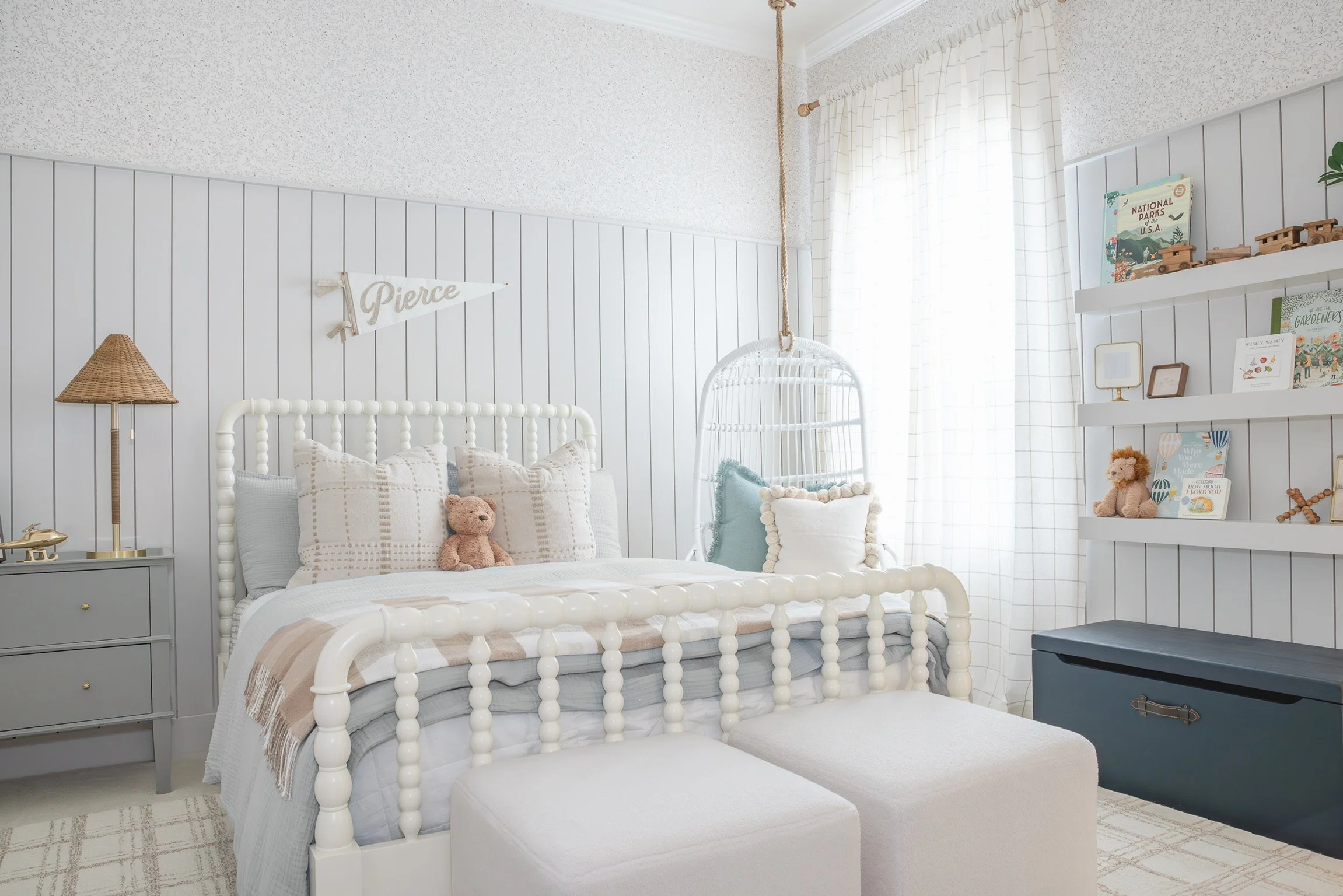 Secondary Bedroom: we added custom wall treatments and wallpaper to give the space some character, and then selected new furnishings, lighting, and decor to make it feel playful and warm.